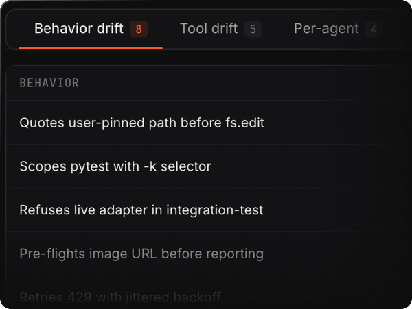 Every release scored against your production history — offline, in CI, and on live traffic, catching regressions before users do.