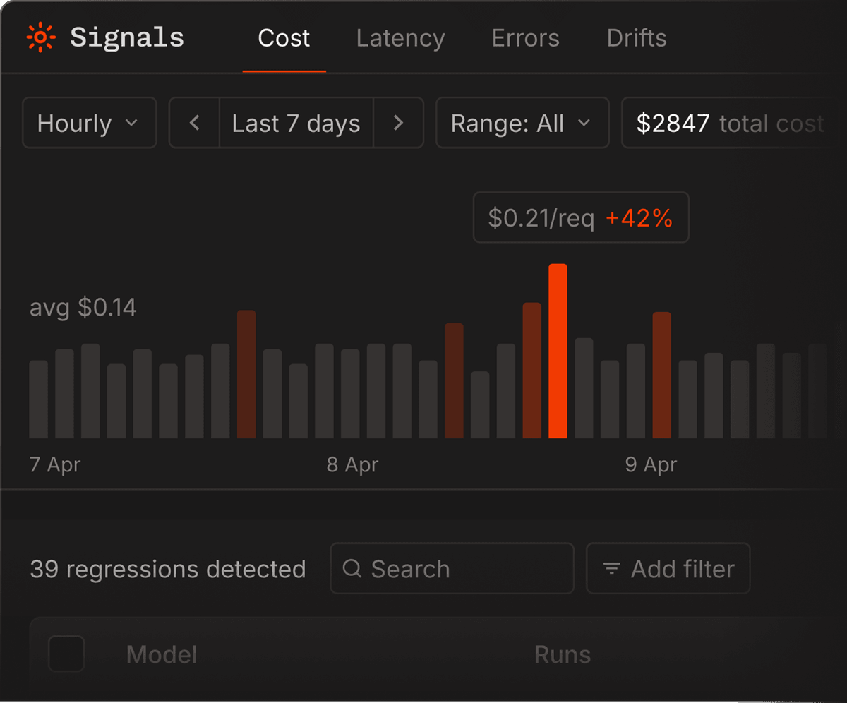 Describe any failure mode in plain English — Bento trains a signal on your own traces, fires it in real time, and backfills your entire history to show how long it's been happening.