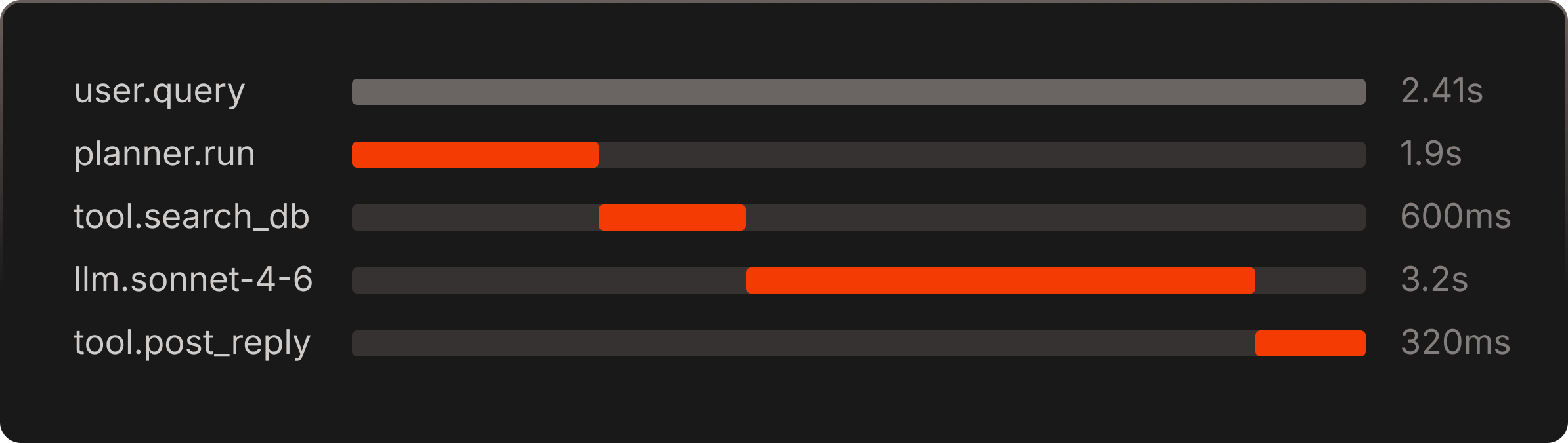 OpenTelemetry-native traces from every framework you run. Jump into the span tree, or follow a signal badge straight to the call that broke.